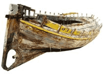 Coque en bois, datant du milieu du 20ème siècle en attente de calfatage dans un chantier