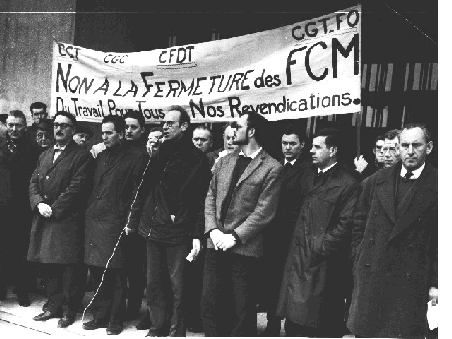La lutte commencée contre les licenciements prend une nouvelle dimension, et une nouvelle banderole résume la signification de l’action: “Non à la fermeture des FCM”., “Du travail pour tous, nos revendications”.